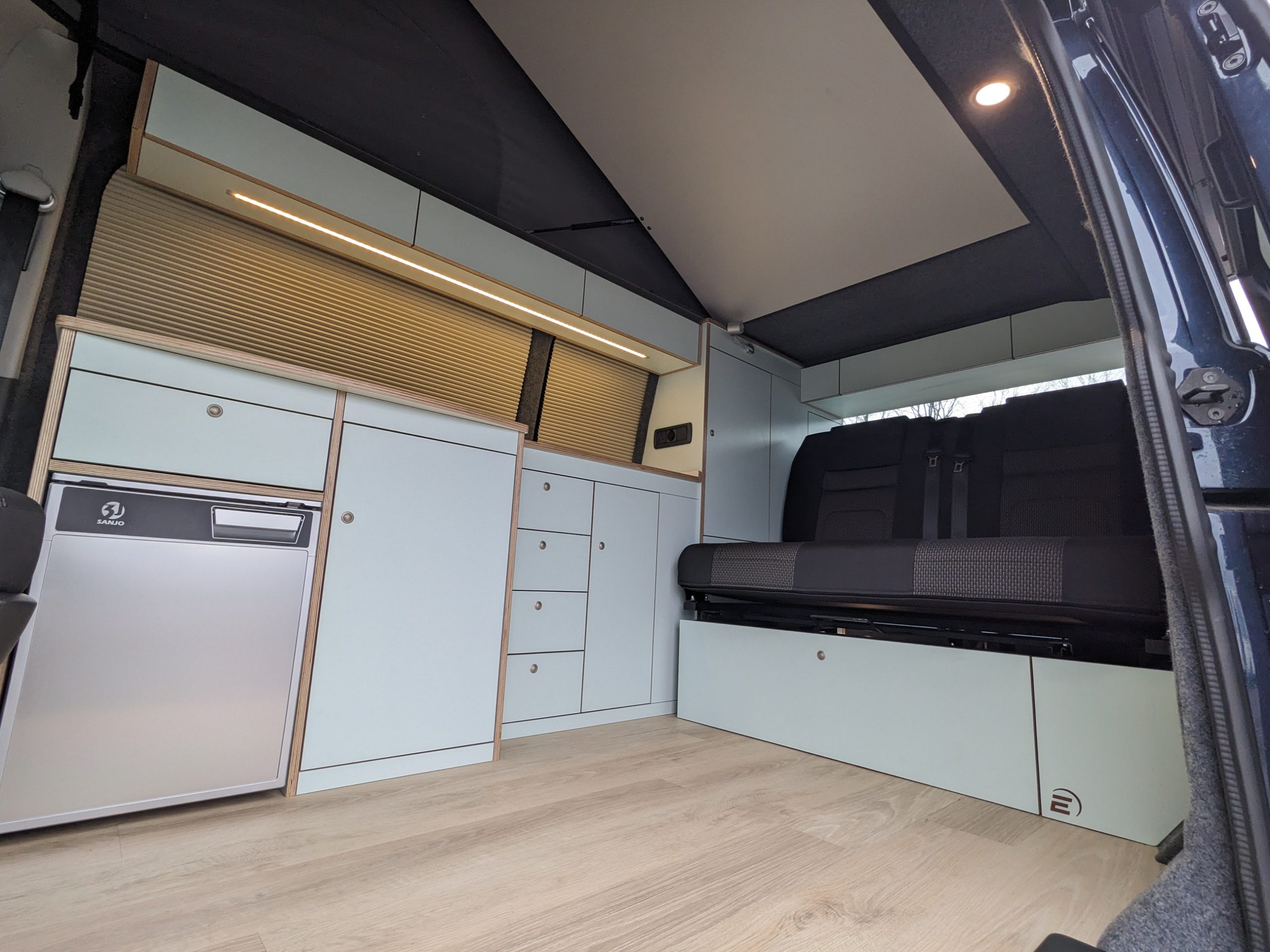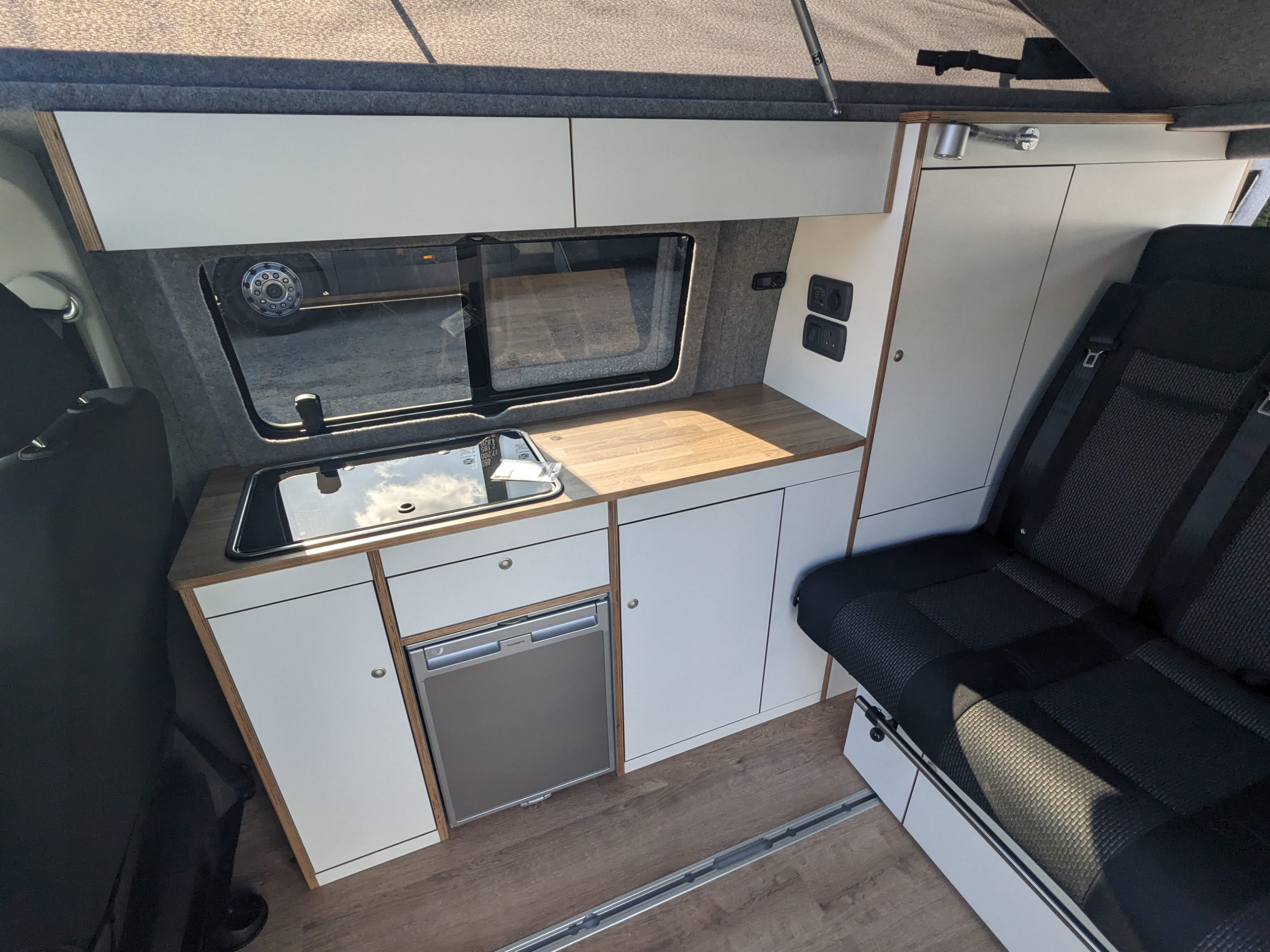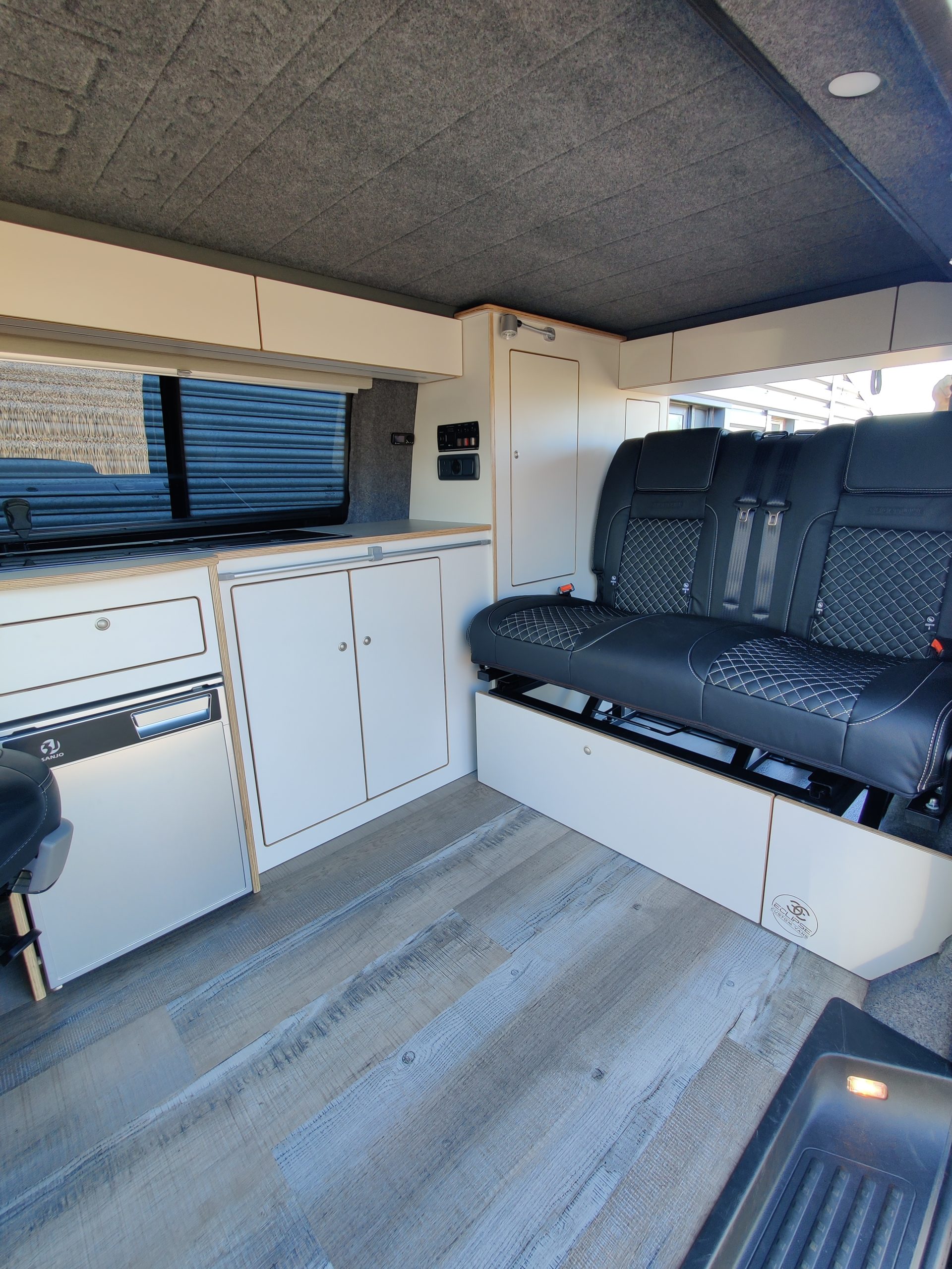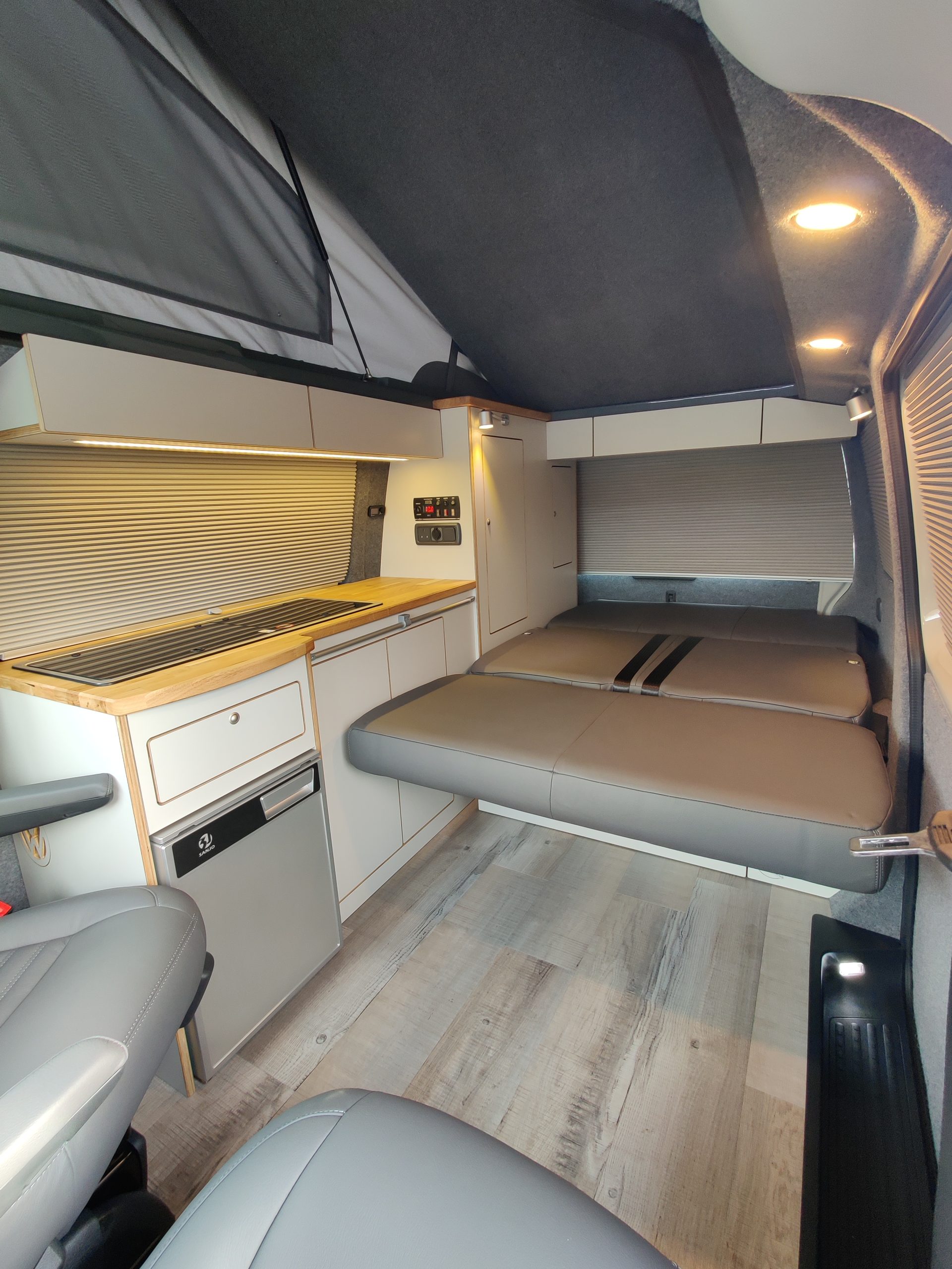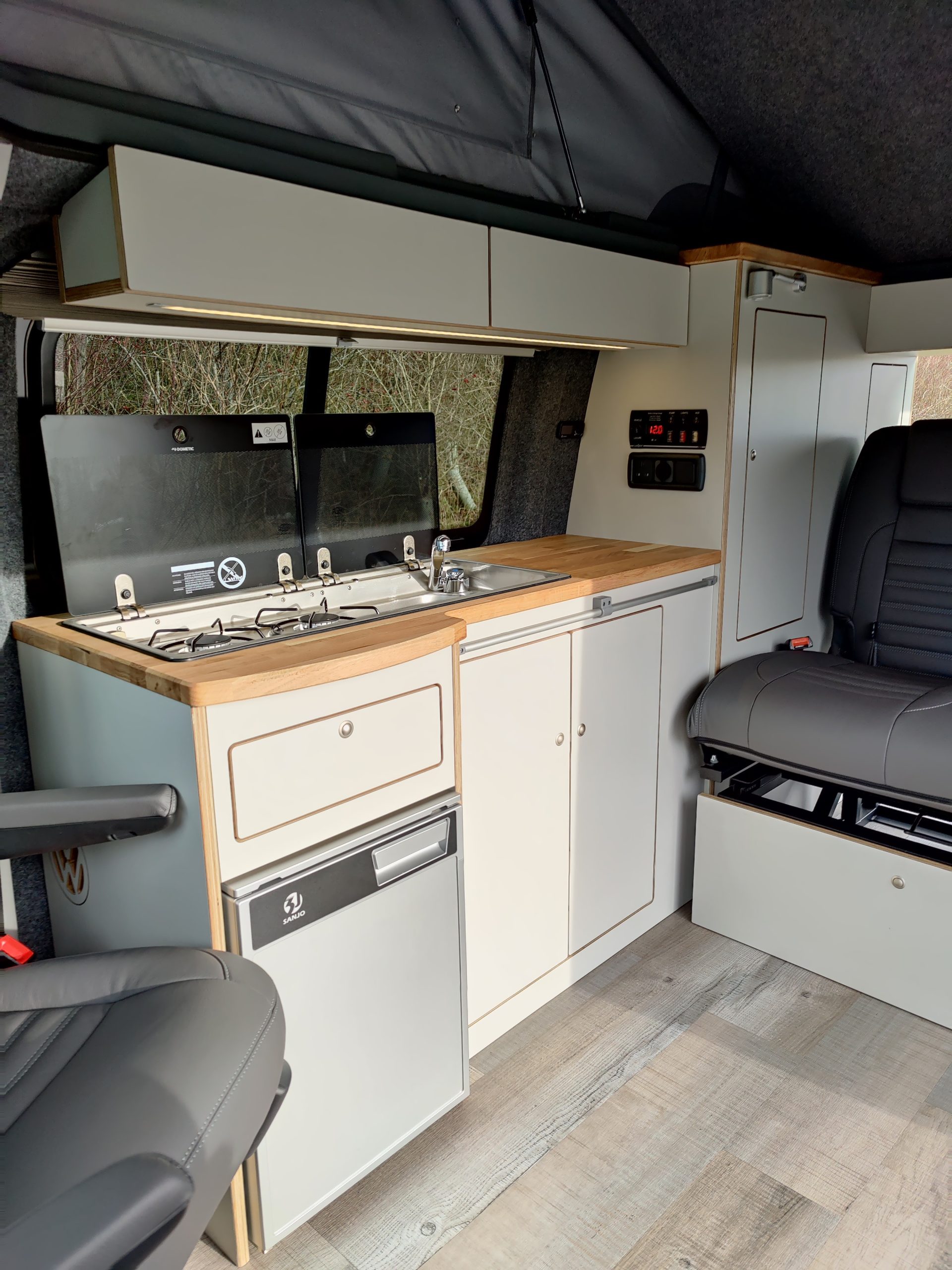 The Olympus, our most sought-after conversion, comes fully equipped with a sleek elevating roof that includes a double bed suitable for adults – boosting the sleeping capacity to a four/five-berth setup. As our most popular build, it comes complete with everything you need for comfortable, family-friendly adventures.