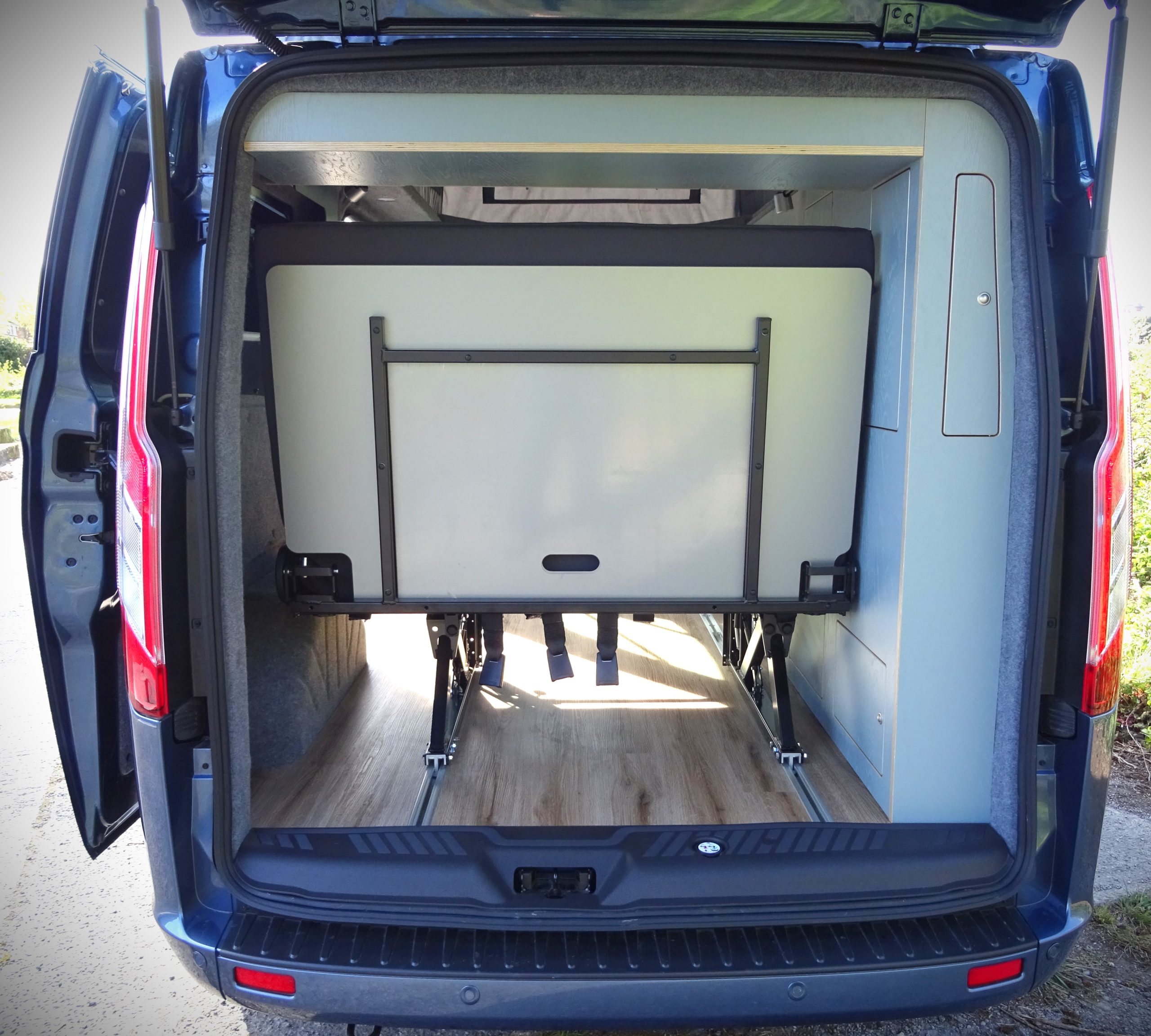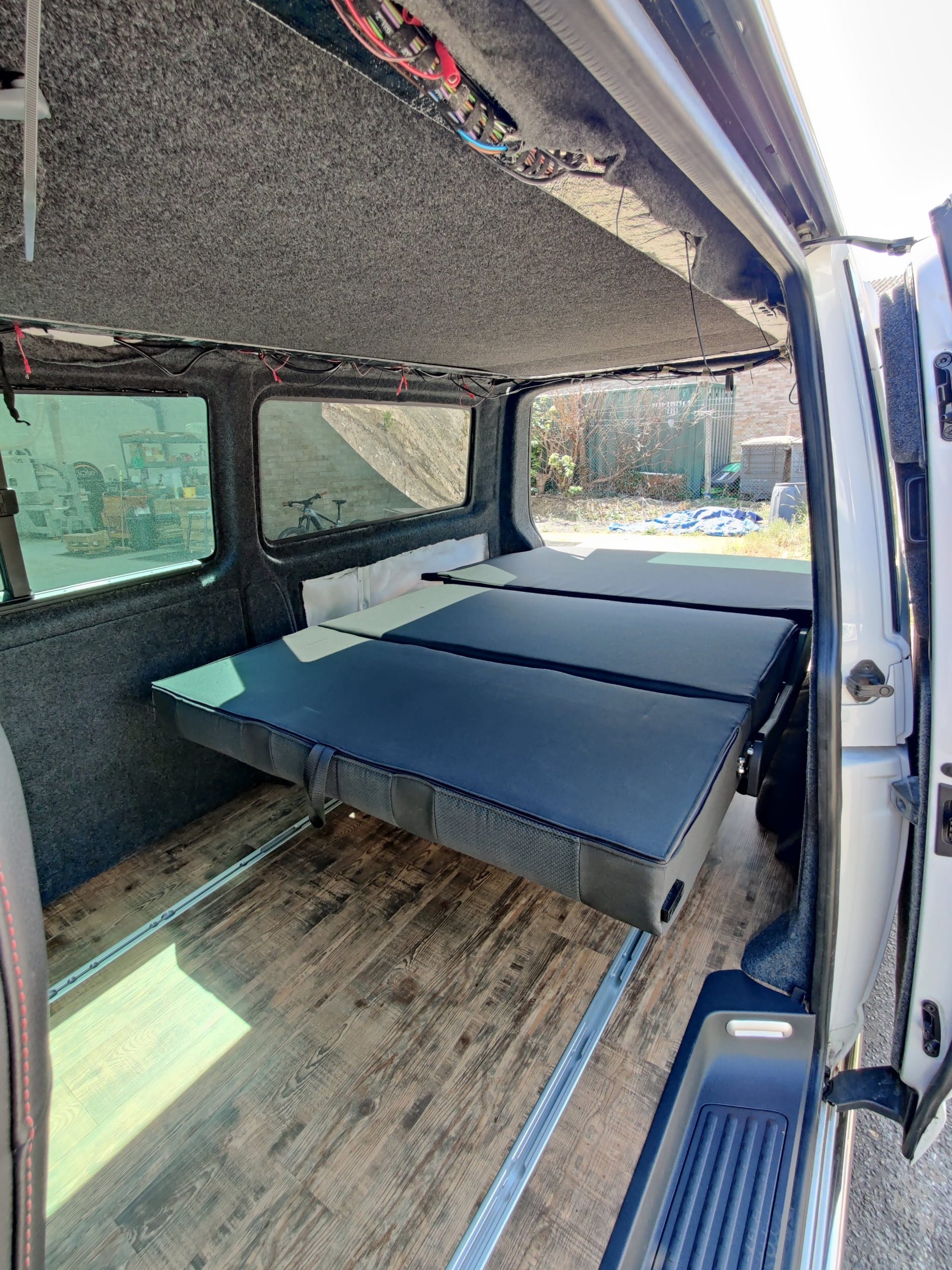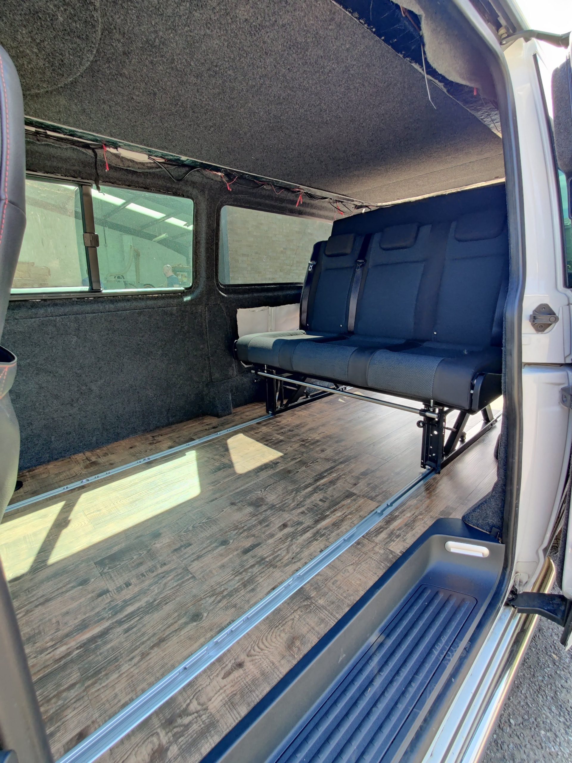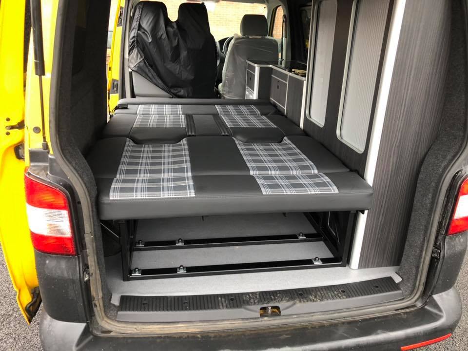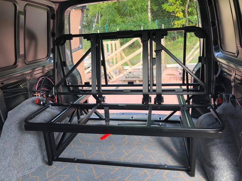 The Rusty Lee 3/4 and full width beds are fully TUV certified. Made from solid box section and all the hinge plates are cnc laser cut. The bed sits over the wheel arch in the rear of the van and fixes through the floor with high tensile bolts and spreader plates. The bed operates on heavy duty ball bearing slides so pulls from seat to bed position with ease, the front legs also sit 5mm higher than your floor so you don’t get any scuff marks on your nice new floor when pulling into bed position. The bed locks off into seat position with two heavy duty quick release spring loaded pins. It sits on rubber buffers, so no rattling when you’re on the move. The frame comes fully powder coated and operates from seat to bed mode in just a few seconds.