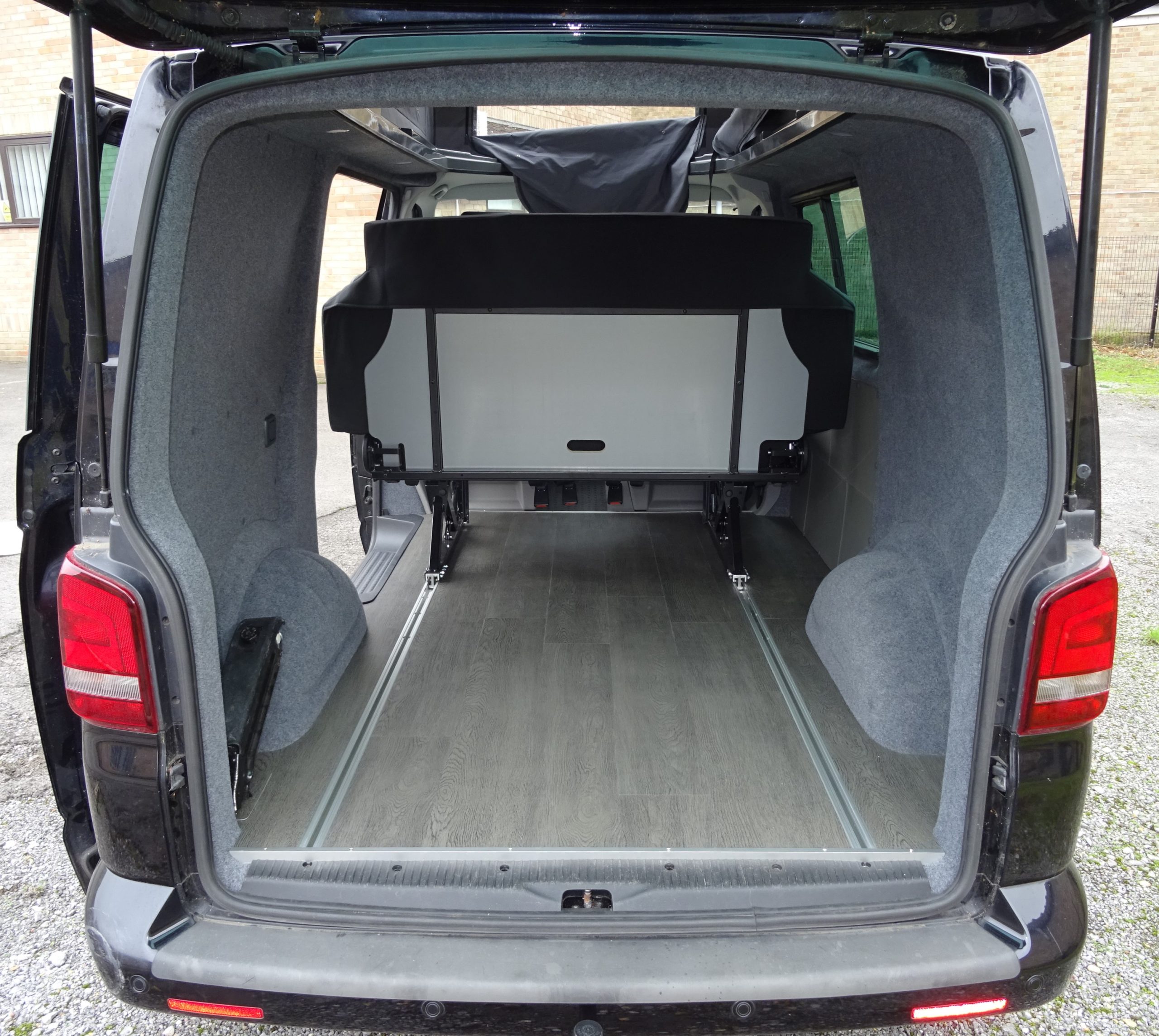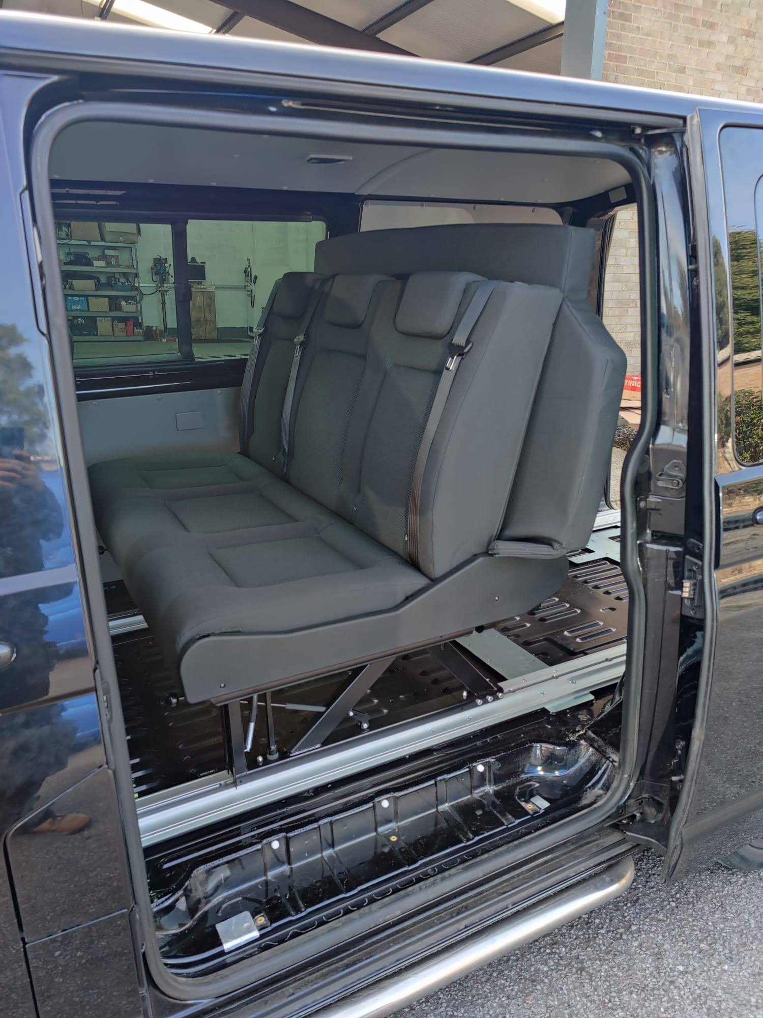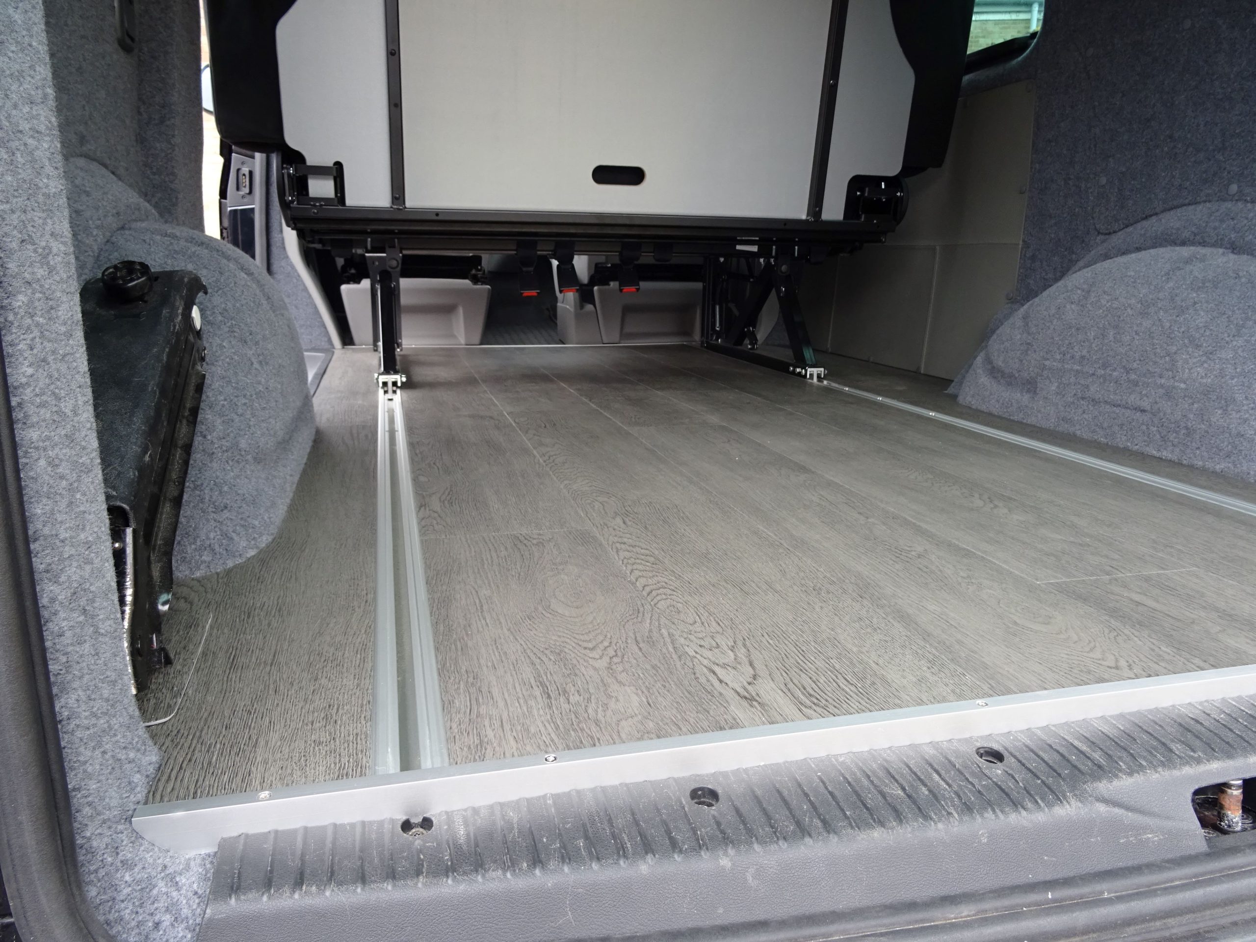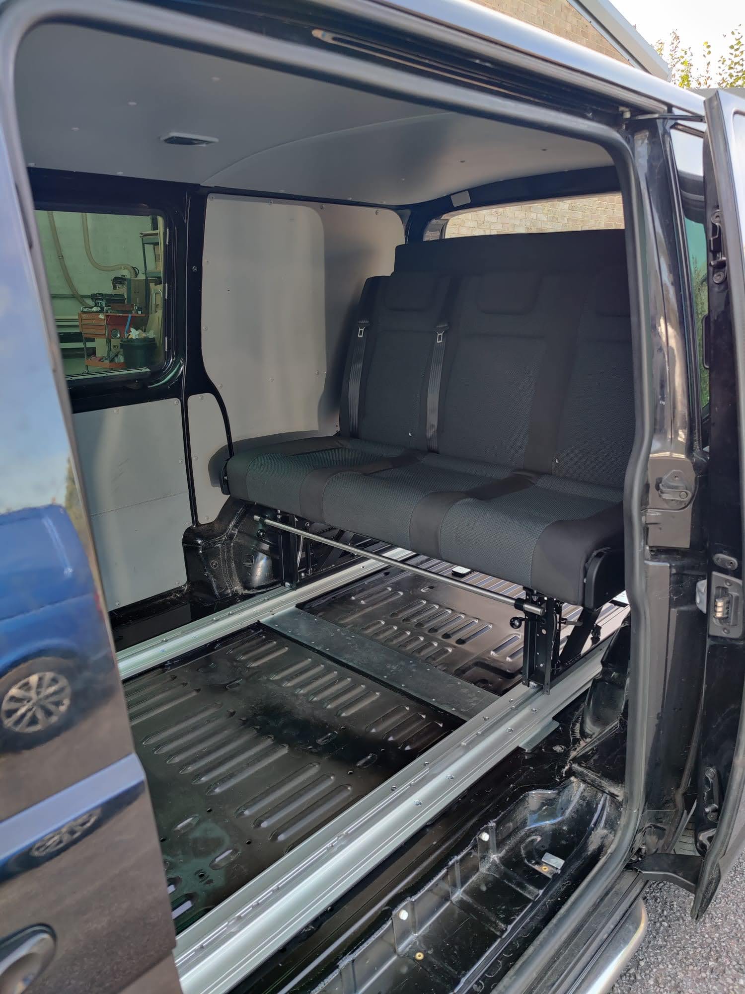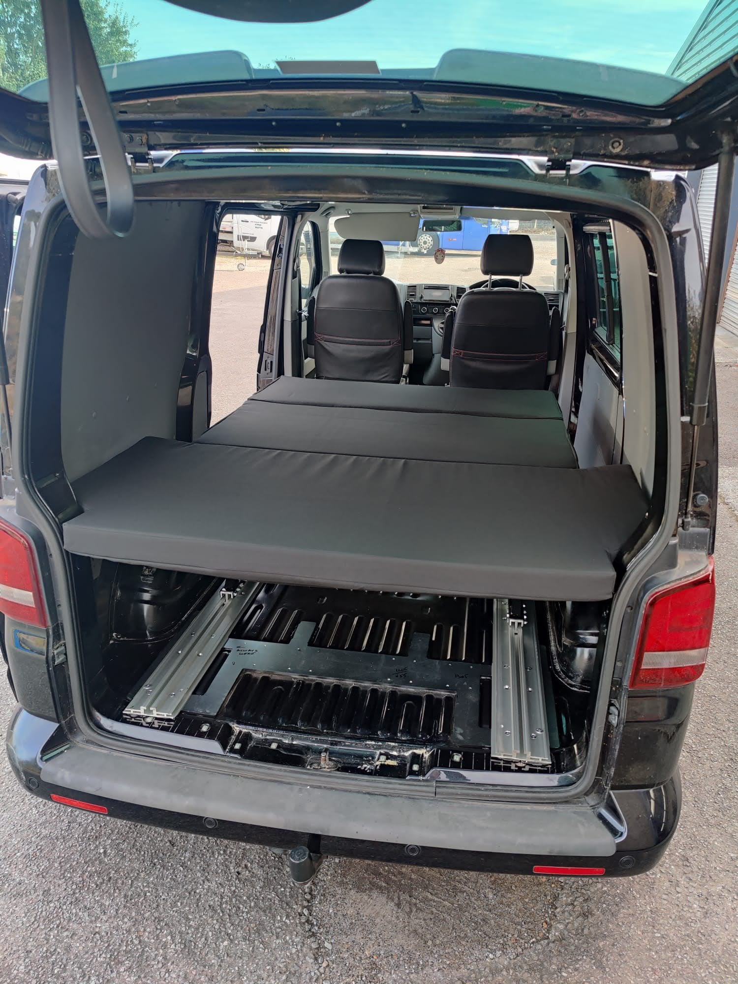 The Rusty Lee 3/4 and full width beds are fully TUV certified. Made from solid box section and all the hinge plates are cnc laser cut. The bed sits over the wheel arch in the rear of the van and fixes through the floor with high tensile bolts and spreader plates. The bed operates on heavy duty ball bearing slides so pulls from seat to bed position with ease, the front legs also sit 5mm higher than your floor so you don’t get any scuff marks on your nice new floor when pulling into bed position. The bed locks off into seat position with two heavy duty quick release spring loaded pins. It sits on rubber buffers, so no rattling when you’re on the move. The frame comes fully powder coated and operates from seat to bed mode in just a few seconds.