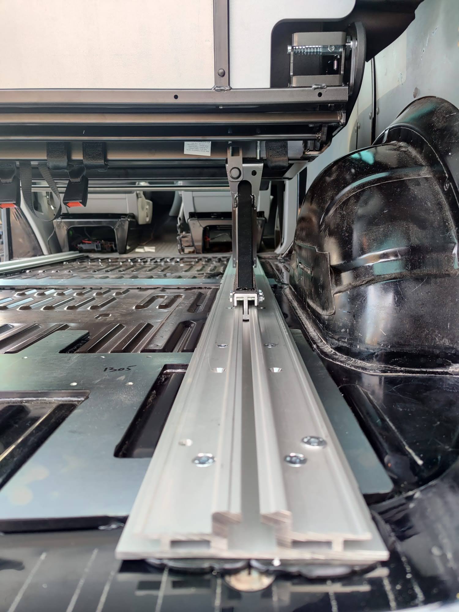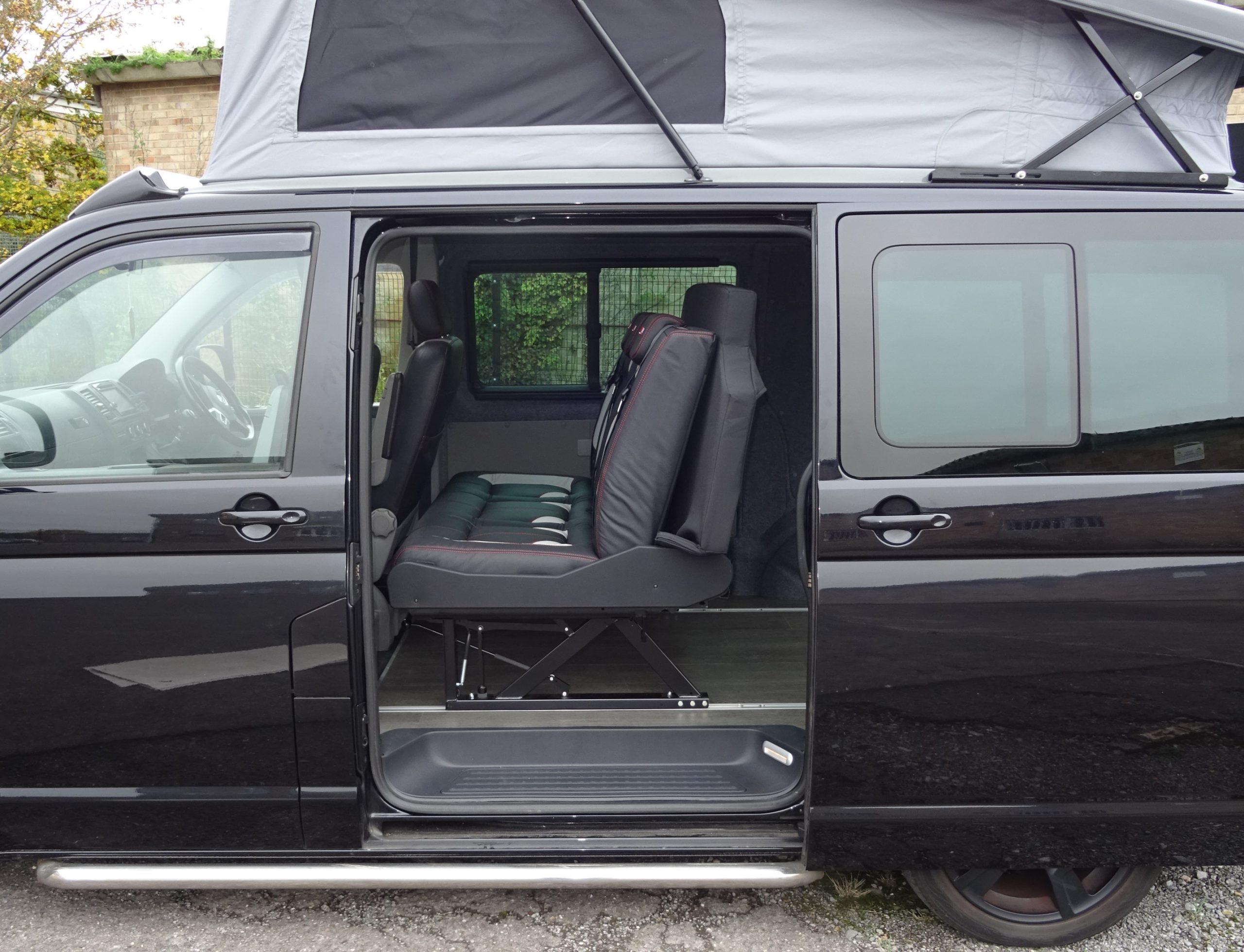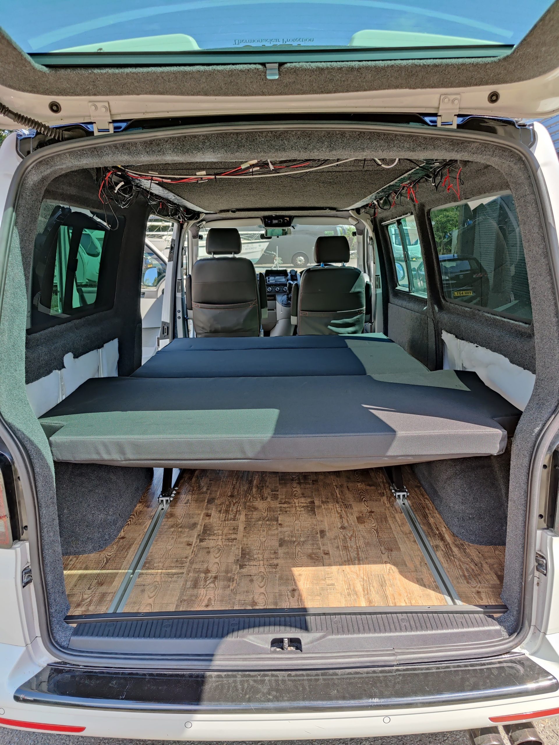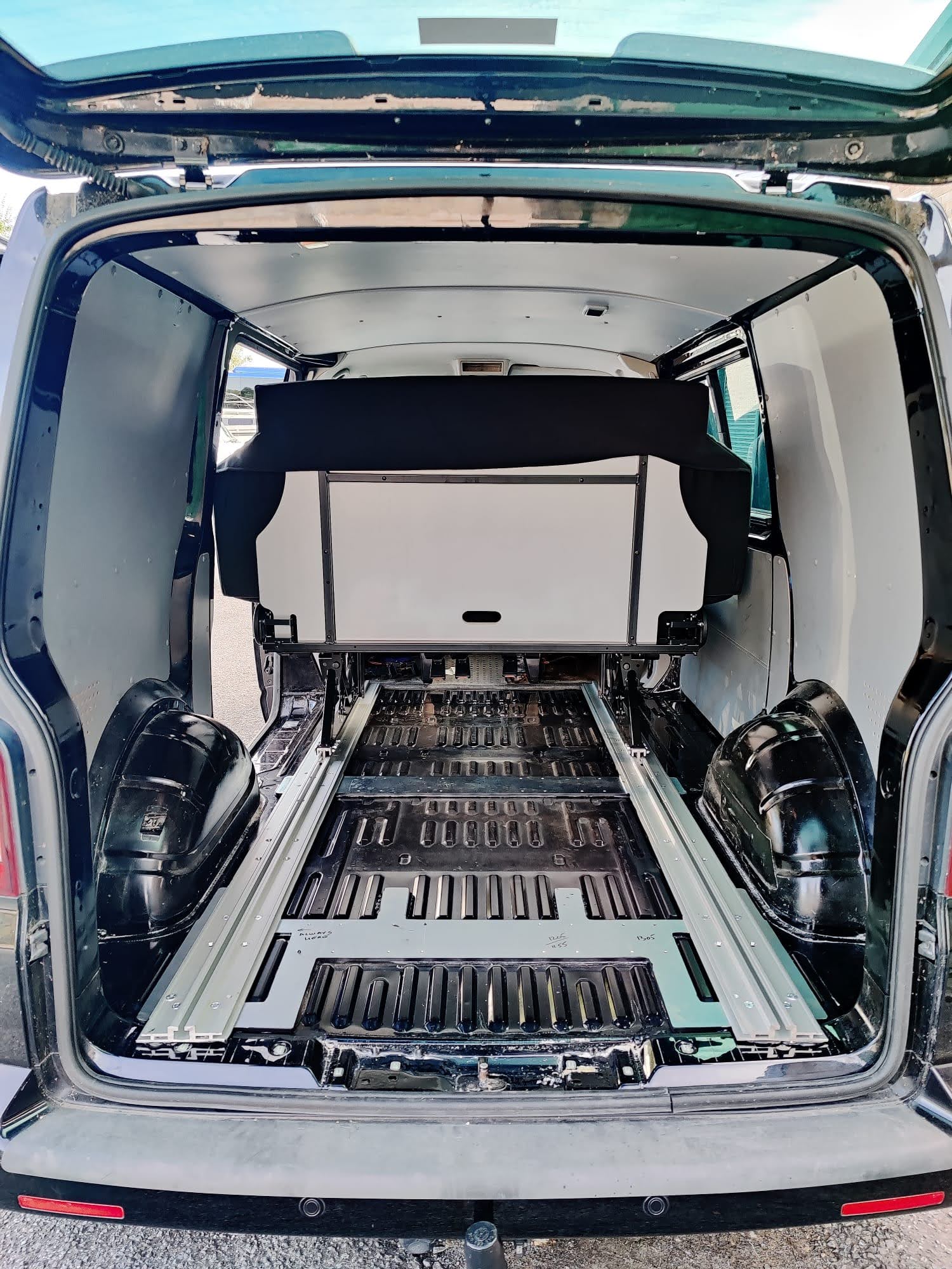 The Rusty Lee 3/4 and full width beds are fully TUV certified. Made from solid box section and all the hinge plates are cnc laser cut. The bed sits over the wheel arch in the rear of the van and fixes through the floor with high tensile bolts and spreader plates. The bed operates on heavy duty ball bearing slides so pulls from seat to bed position with ease, the front legs also sit 5mm higher than your floor so you don’t get any scuff marks on your nice new floor when pulling into bed position. The bed locks off into seat position with two heavy duty quick release spring loaded pins. It sits on rubber buffers, so no rattling when you’re on the move. The frame comes fully powder coated and operates from seat to bed mode in just a few seconds.