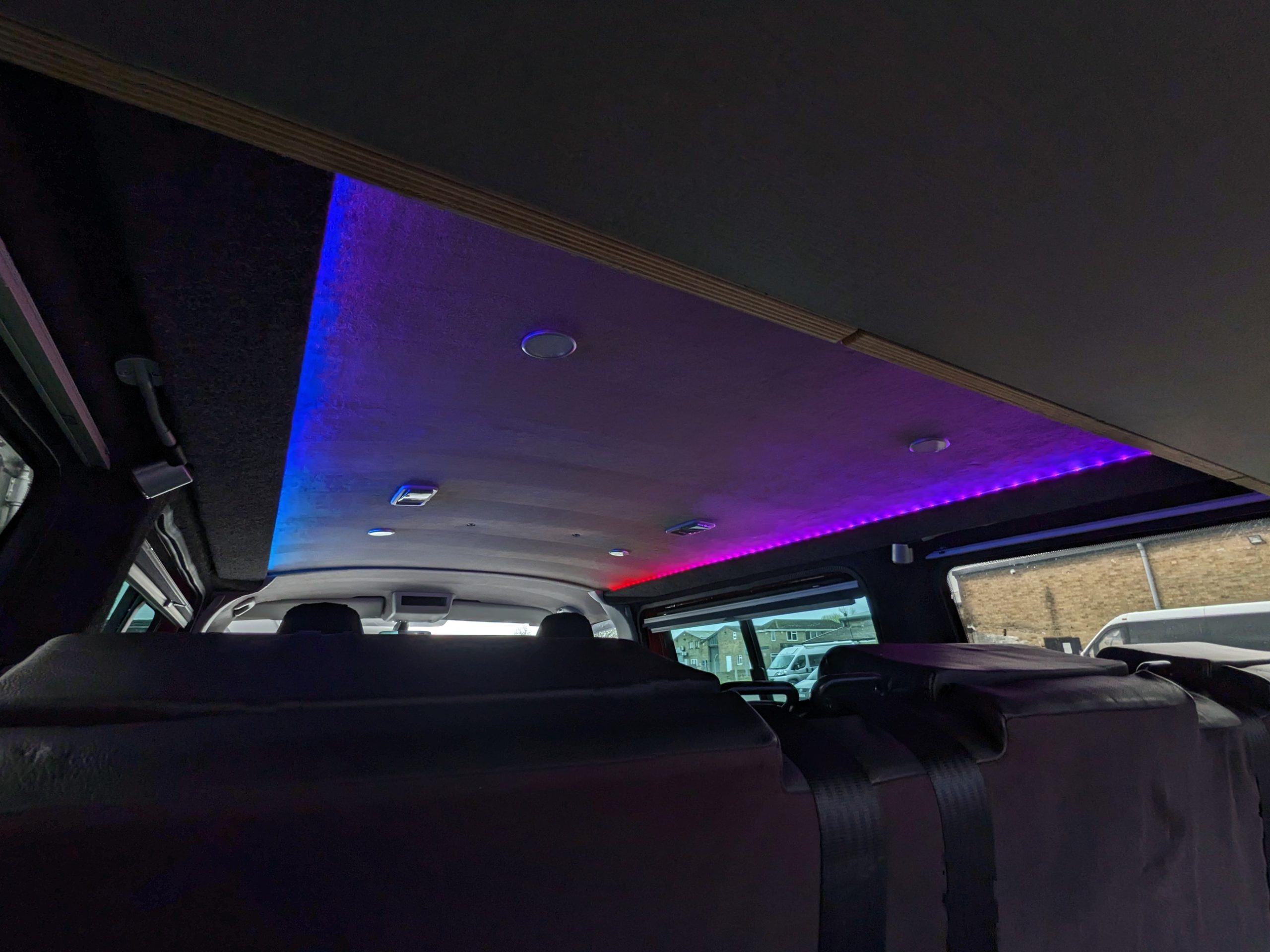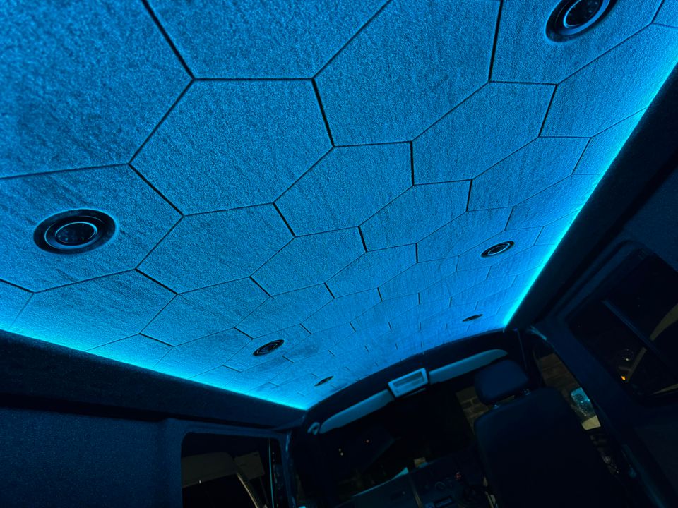 Our Halo roof kits are designed to replace your van’s standard OEM ceiling panels, adding both style and functionality. Each kit features an external ‘Halo’ trim wher a LED strip is fited to cast a soft, ambient glow across the ceiling—creating a stunning lighting effect. They’re engineered to fit perfectly using the factory roof mounting points, so there’s no need for any drilling—just a seamless, hassle-free upgrade. They are avialbe in plain or patterned finish with or without speaker kits.