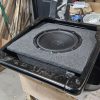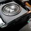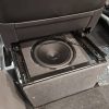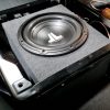 10″ custom sub enclosure is built to fit neatly under the single passenger seat in VW Transporters.